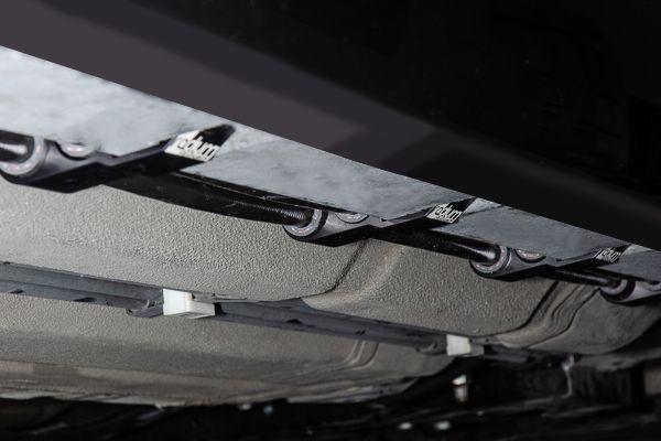 Поскольку посадка очень плотная, выход -10AN «PUMPS» сначала разделяется на две линии питания -6AN. Двойные магистрали из ПТФЭ 6AN проходят параллельно под автомобилем и закрепляются с помощью алюминиевых фиксаторов с OEM-оборудованием.