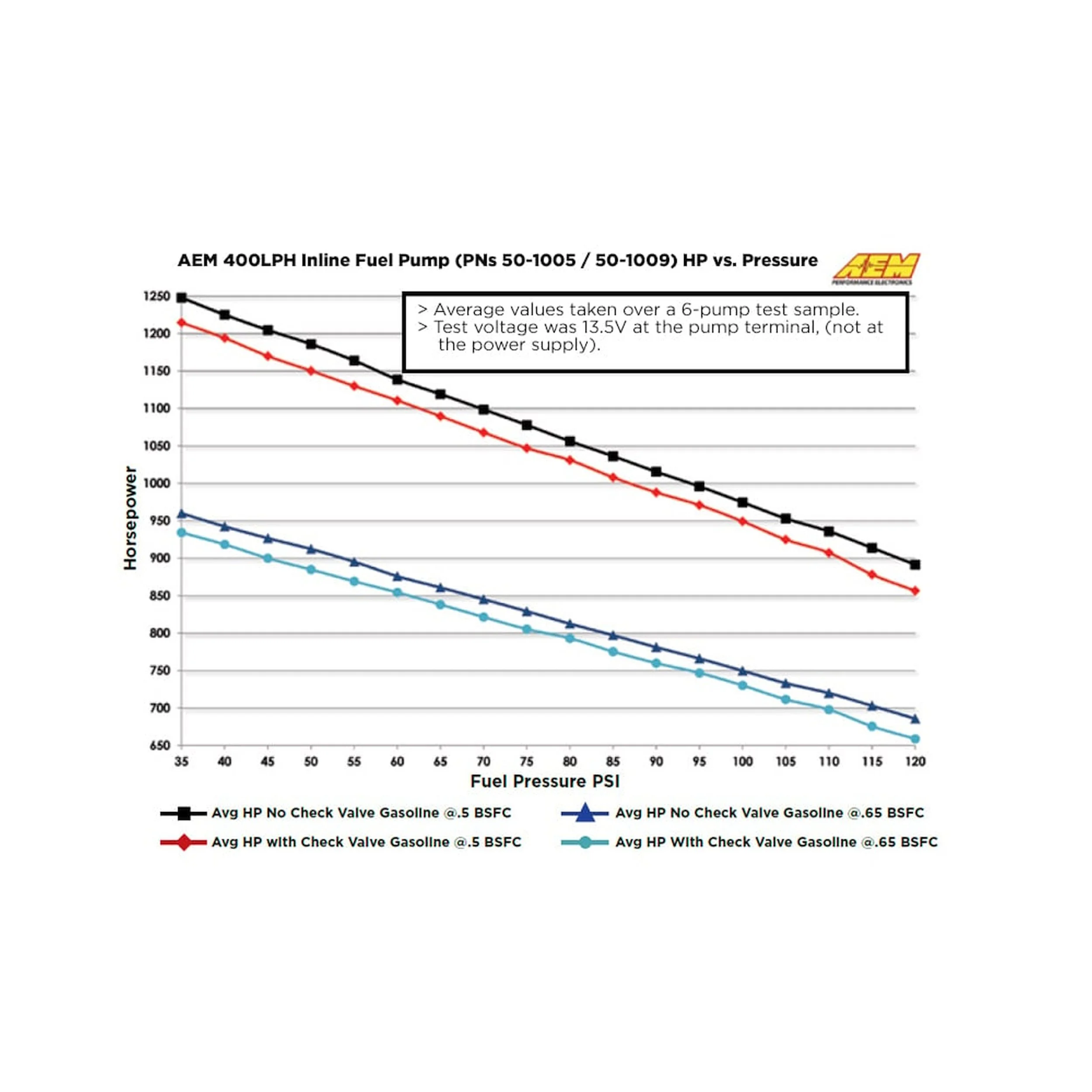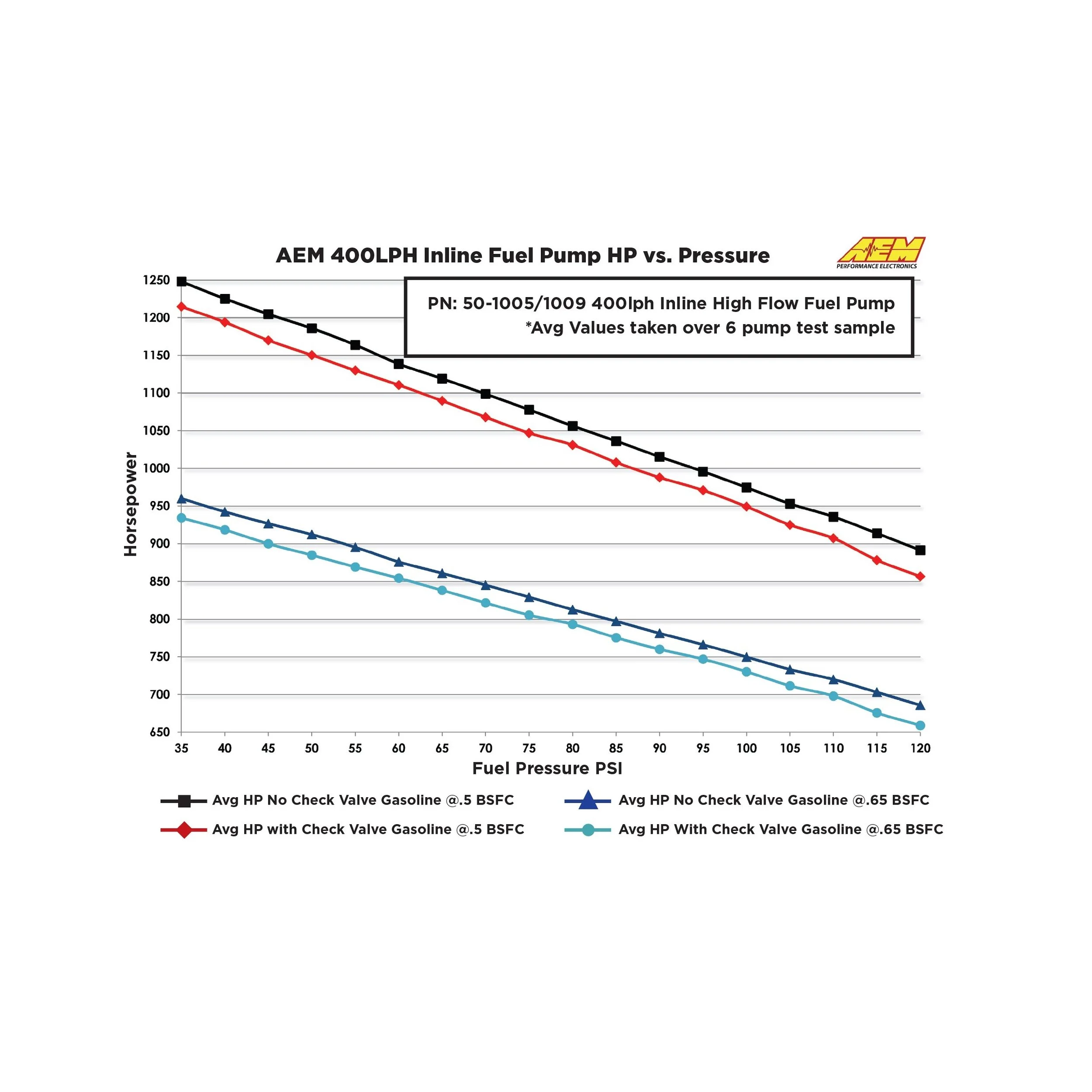 Высокопроизводительный топливный насос высокого давления AEM мощностью 400 л/ч способен поддерживать мощность более 1200 л.с. без наддува и колоссальные 860 л.с. при наддуве 30 фунтов на квадратный дюйм!* Он пропускает 400 л/ч (100 галлонов в час) при 40 фунтах на квадратный дюйм, 340 л/ч (90 галлонов в час) при 73 фунтах на квадратный дюйм и 270 л/ч (71 галлон в час) при 120 фунтах на квадратный дюйм. Полные кривые расхода от 35 до 120 фунтов на квадратный дюйм и диаграммы зависимости потребляемого тока от давления топлива доступны на вкладке «Спецификации».