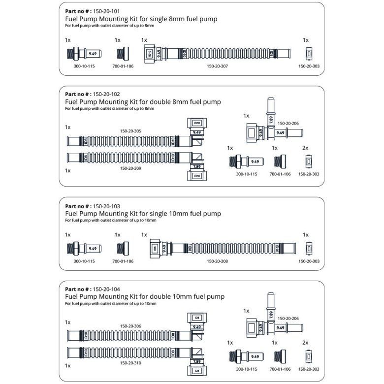 Доступно для топливных насосов с одним или двумя баками, а также для топливных насосов с диаметром выпускного отверстия 7,5–10 мм. Найдите свой топливный насос в списке ниже и выберите правильный размер при размещении заказа.